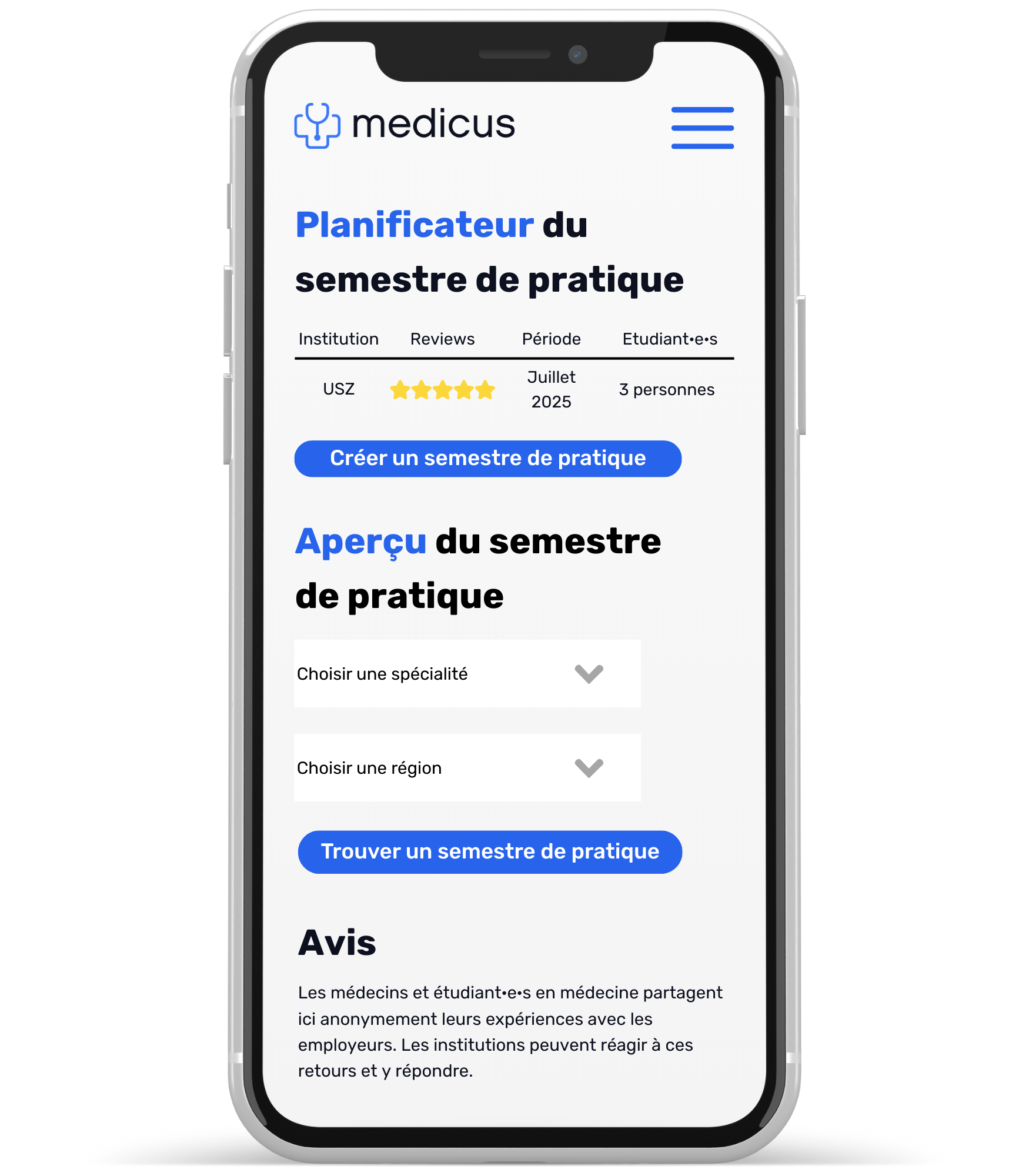 Avec des témoignages authentiques et le planificateur de l’année de stages, tu sais à quoi t’attendre et qui sera avec toi sur place. Rejoins la plus grande communauté d'étudiants en médecine en Suisse – gratuite et riche en connaissances exclusives.